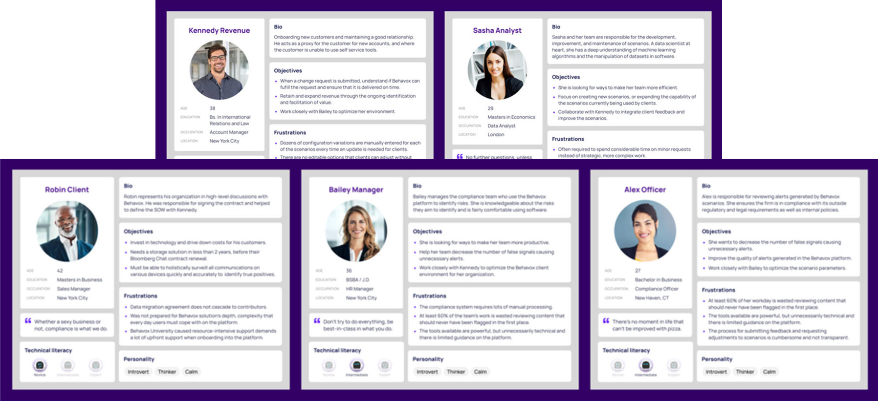 Following our usability testing and many discussions with subject matter experts, the UX team created a series of user personas to use as we continued to iterate on the product design. For the comparison tool, we focused on the primary client persona that would use the tool regularly, in addition to the sales representative persona who needed to be able to demo the tool effectively to prospective clients.