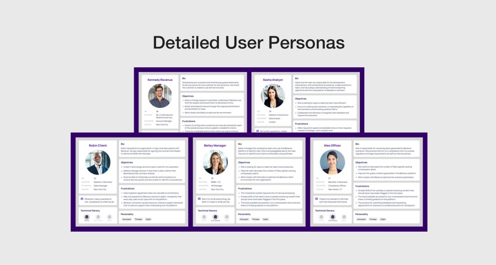 Following our usability testing and many discussions with subject matter experts, the UX team created a series of user personas to use as we continued to iterate on the product design. For the comparison tool, we focused on the primary client persona that would use the tool regularly, in addition to the sales representative persona who needed to be able to demo the tool effectively to prospective clients.